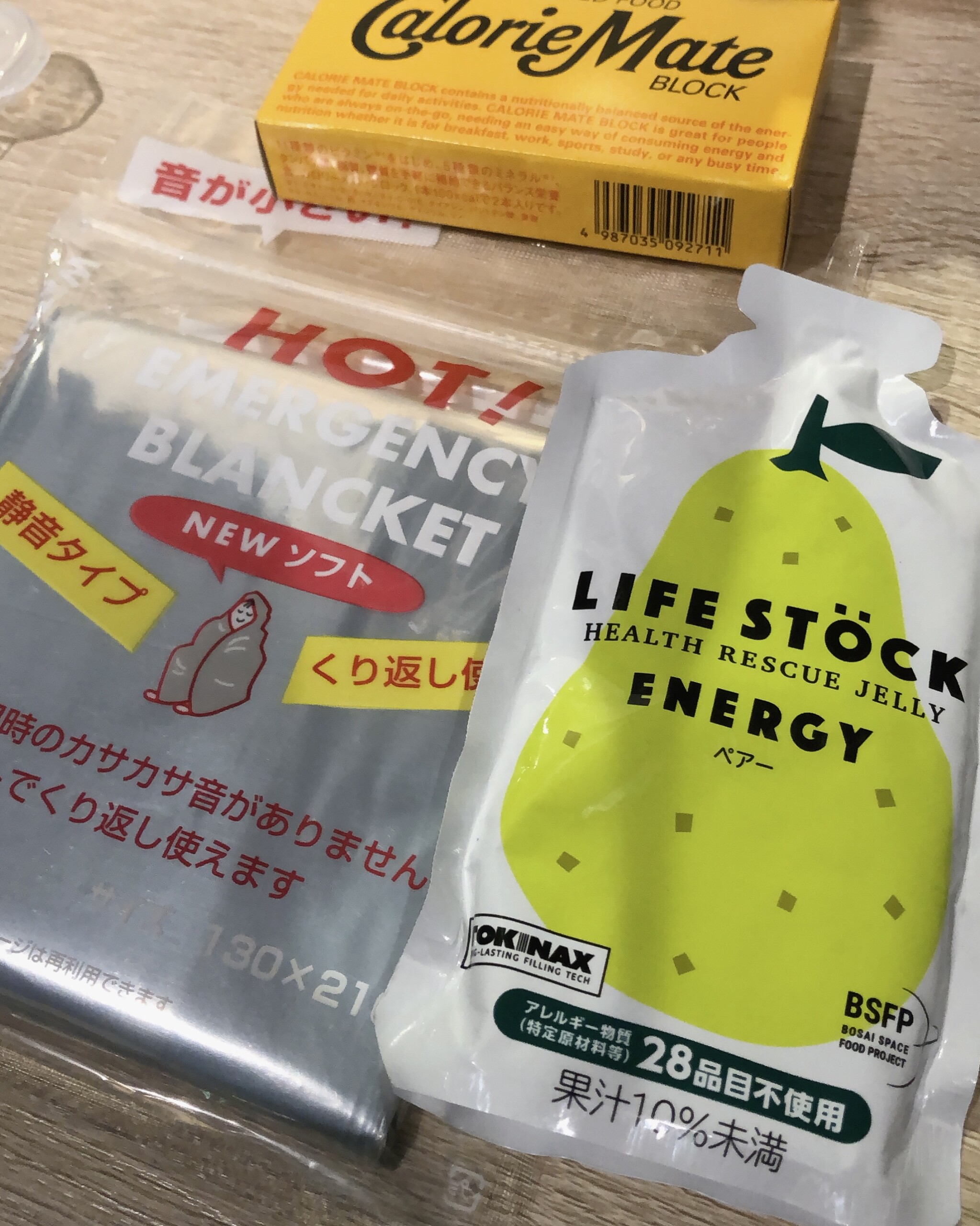 手始めに、年始に東京に行く機会があったので「電車が止まって、歩いて帰らなければならないことがあるかも」という想定をして、東急ハンズで防災グッズの買い出しをしてみた。エマージェンシーシートが予想より薄く小さかったので、試しに購入。ペットボトルの7年保存水や、カロリーメイトやゼリーなども買ってみた。普段間食をしないので、食品をバッグの中にストックしておくのは私にとっては新鮮なことだったが、これが私の「1日分の防災」として、ちょうどいいと感じている。